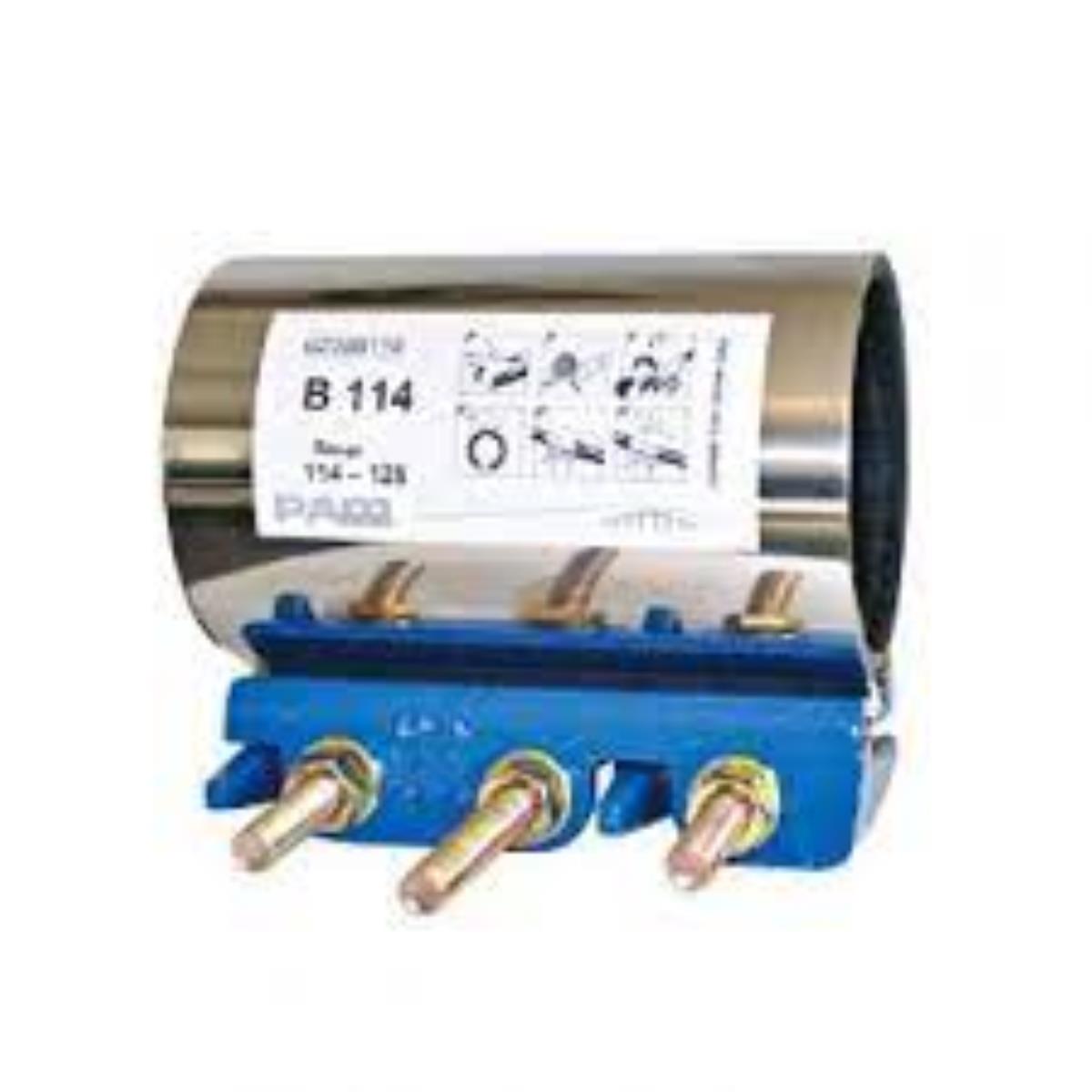 Three-bolt repair collar for repairing localized breaks and small holes in any pipe. Stainless steel band.