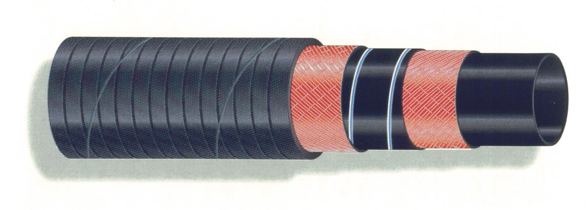 Hose for suction and delivery of fuels, oils and lubricants, diesel with aromatic content up to 50%. Smooth black NBR rubber tube, with textile reinforcement, steel spiral and incorporated copper cables for earthing.
