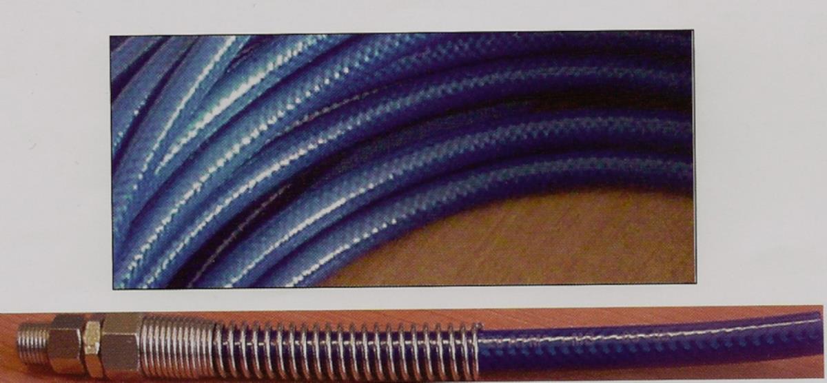 Tubo lineare in poliuretano antistatico autolubrificato con rinforzo tessile, flessibile multistrato di poliuretano base Etere resistente all'idrolisi e alla corrosione microbiotica. Rinforzo interno con treccia in FIBRA DI POLIESTERE ad alta tenacità  incollata, maglia rombica per la massima resistenza alla pressione.
